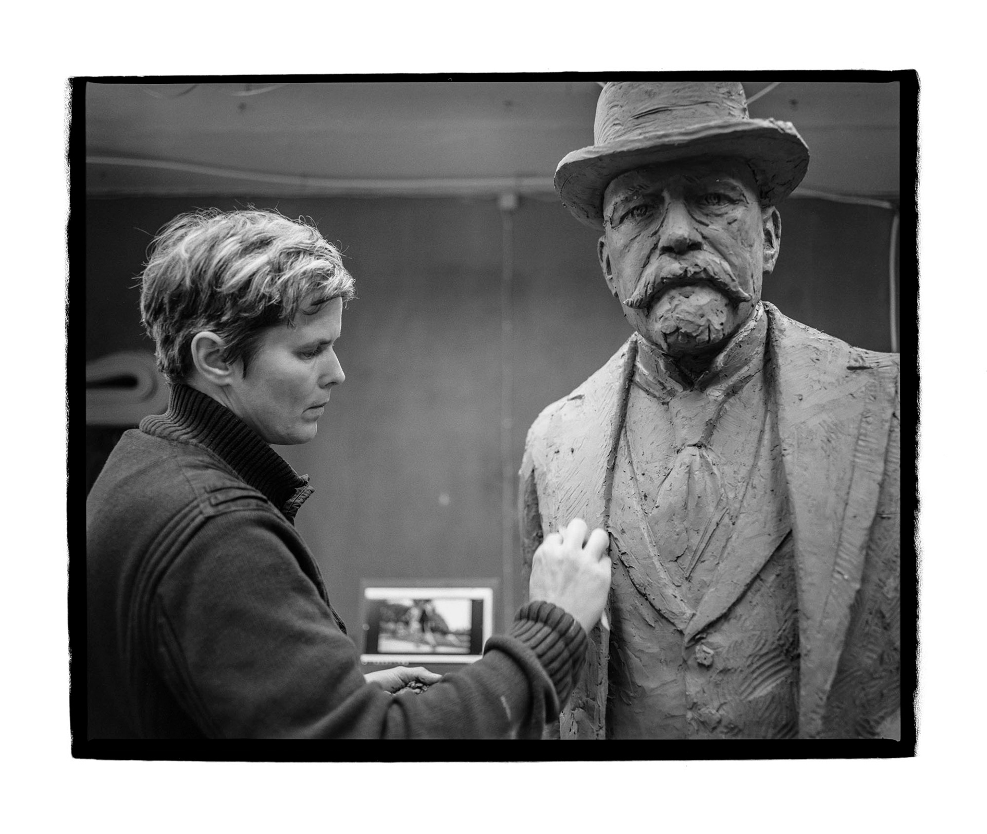 Sculpting was based on rare photos of the man himself while also new photos were created with the help of a model whose attitude and professionalism the sculptor compared to Mr. Poska himself. Even more authenticity was achieved by letting the model wear specially made era-based clothing. This allowed the sculptor to get detailed photos from every angle and give believability to the pose and the way the clothes would behave. As soon as the clay model was deemed ready with the deadline looming it was quickly covered in plaster in order to get a full body mold for bronzework involving casting and welding.